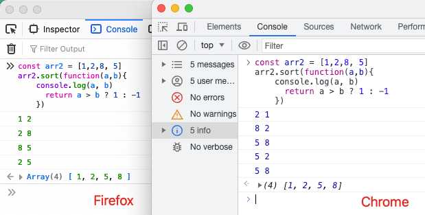 从图中不仅可以看出a,b顺序不同,compareFn函数的执行次数也不同,Firefox中执行了4次,Chrome中执行了5次,